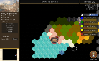 - Found cities to generate Food/Production, unlock Warriors/Archers/Lancers, and claim coastlines to build Shipyards and Boats.