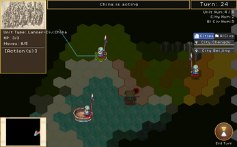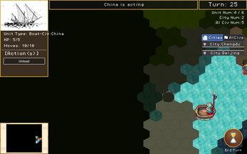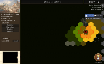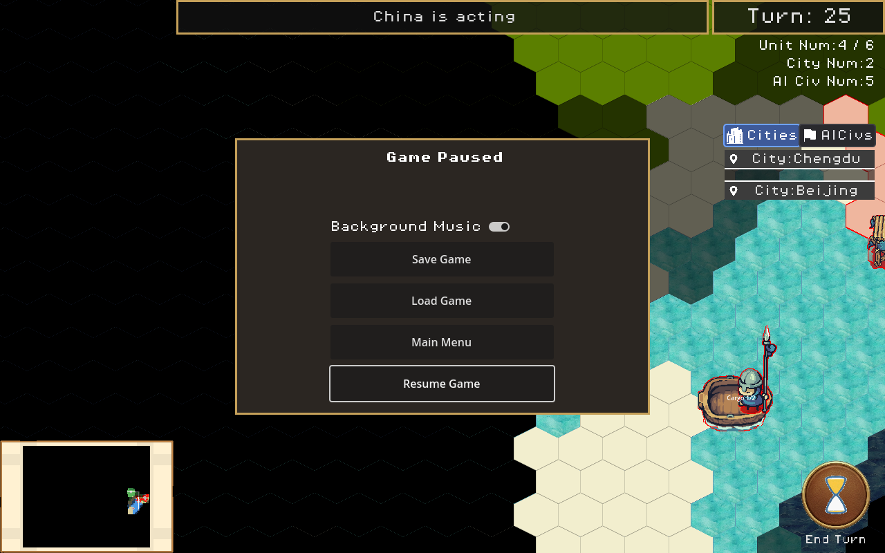 - In: city founding/production, land & naval units, AI turns, fog of war, procedural maps, save/load, resolution/window-mode settings.